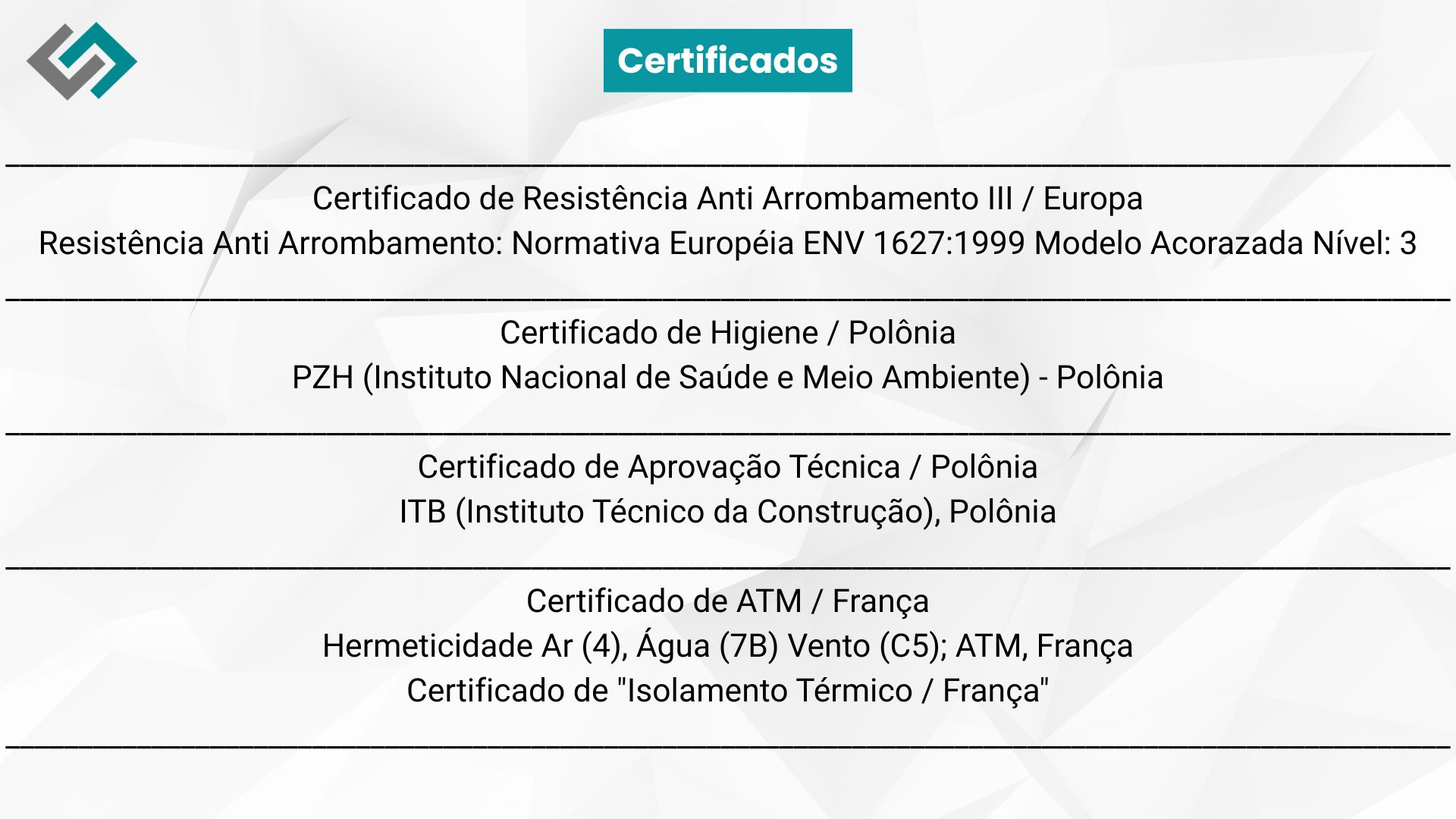 • Fechaduras de 3 a 5 fechaduras com até 20 pontos de travamento. Cilindro europeu com chaves multiponto codificadas.