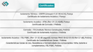• Estrutura: Fabricada mediante a união de 2 lâminas de aço galvanizado de 1 mm, sem soldas, obtendo uma folha/monobloco de 47 mm de espessura. O núcleo está constituído por espuma rígida de poliuretano de alta densidade que oferece um excepcional isolamento térmico e acústico;